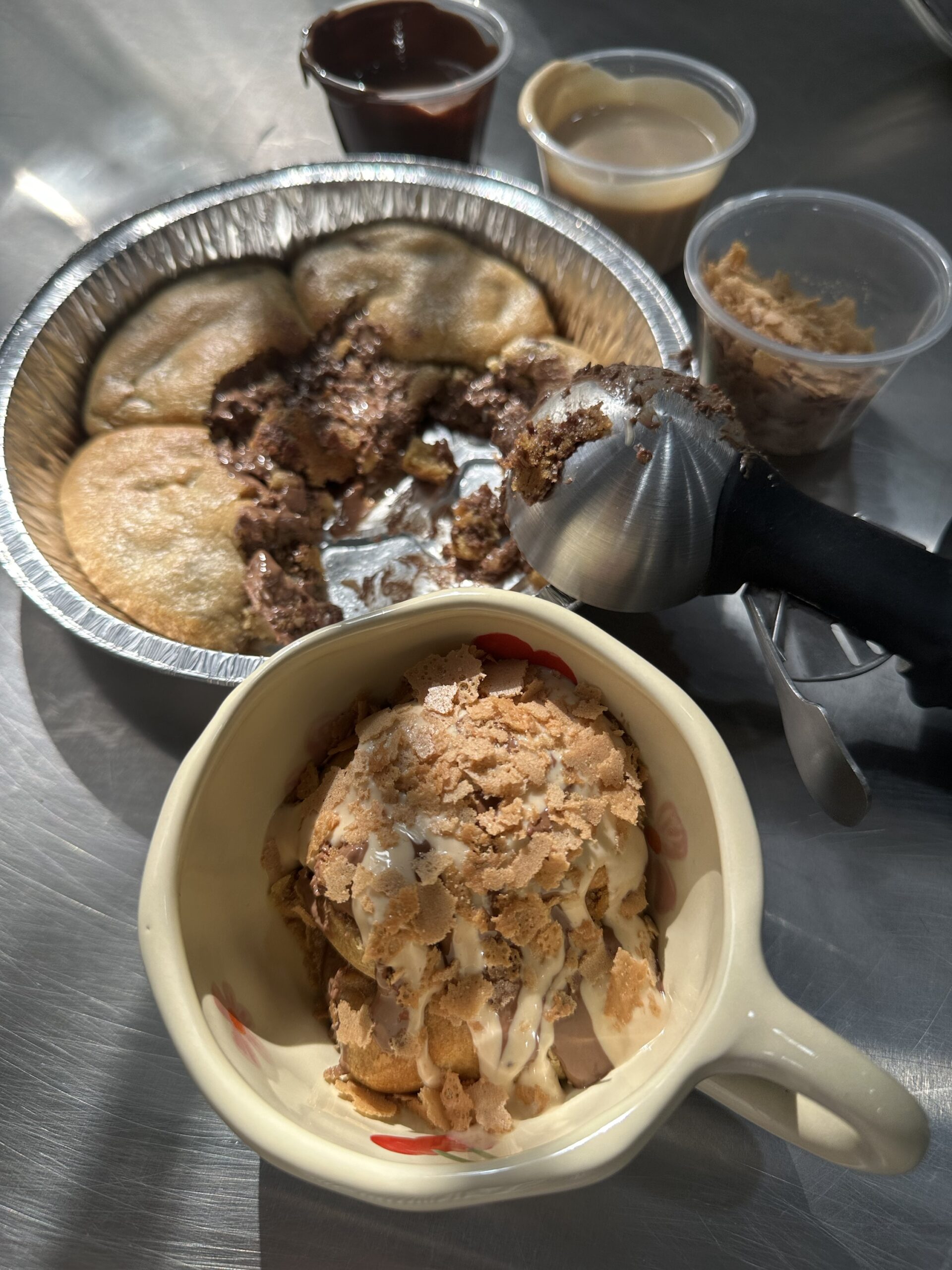 تحتوي عدة السكوب كوكيز اللذيذة على عجينة الكوكيز المجمدة الكلاسيكية (6 حبات)، مع صوص كندر، وصوص ميلك جوكلت بلجيكي، الفوييتين المقرمش.